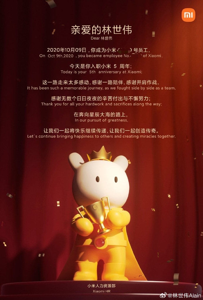 未经允许不得转载:紫竹林-程序员中文网 » 小米集团副总裁兼首席财务官林世伟入职 5 周年,雷军亲自颁发“金米兔”