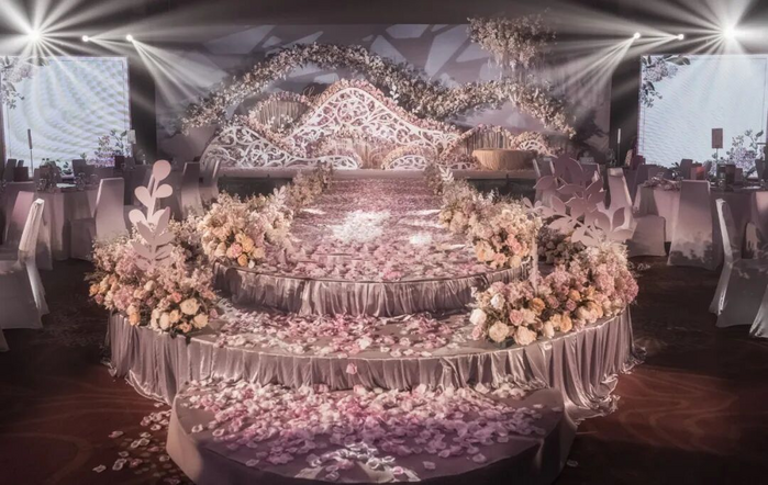 婚礼堂代表一种新的婚礼布置形式。以往,新人多数选择婚庆公司定制现场,费用高昂,动辄十万二十万。若要单独加吊顶,还要多收2万到10万或更高。