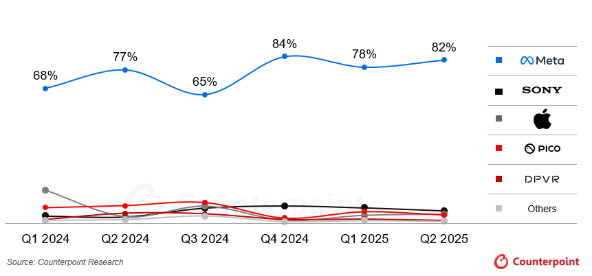 根据Counterpoint全球XR(AR/VR)头显出货量的最新研究,在消费需求持续疲软的背景下,2025年上半年全球虚拟现实(VR)头显出货量同比下降14%。竞争格局保持相对稳定,主要原始设备制造商(OEM)的新产品发布寥寥无几。Meta保持了明显的领导地位,在2025年上半年占大约80%的市场份额。