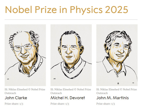相比于前两个奖项得主有点“接地气”的研究方向,物理学奖得主们约翰·克拉克、米歇尔·H·德沃雷和约翰·M·马蒂尼斯就有点科幻了,他们凭借着在电路中实现宏观量子力学隧穿效应和能量量子化方面的贡献拿奖。