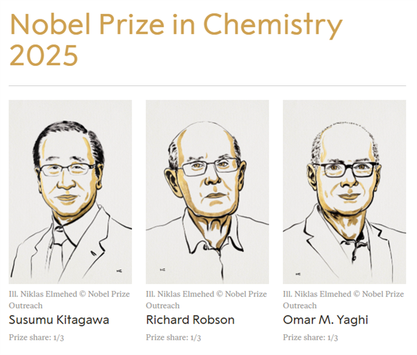 化学家的得主分别来自日本京都大学的北川进、澳大利亚墨尔本大学的理查德·罗布森以及美国加州大学伯克利分校的奥马尔·亚吉,凭借着发展了金属有机框架,开创了一种全新的分子建筑学成功得奖。