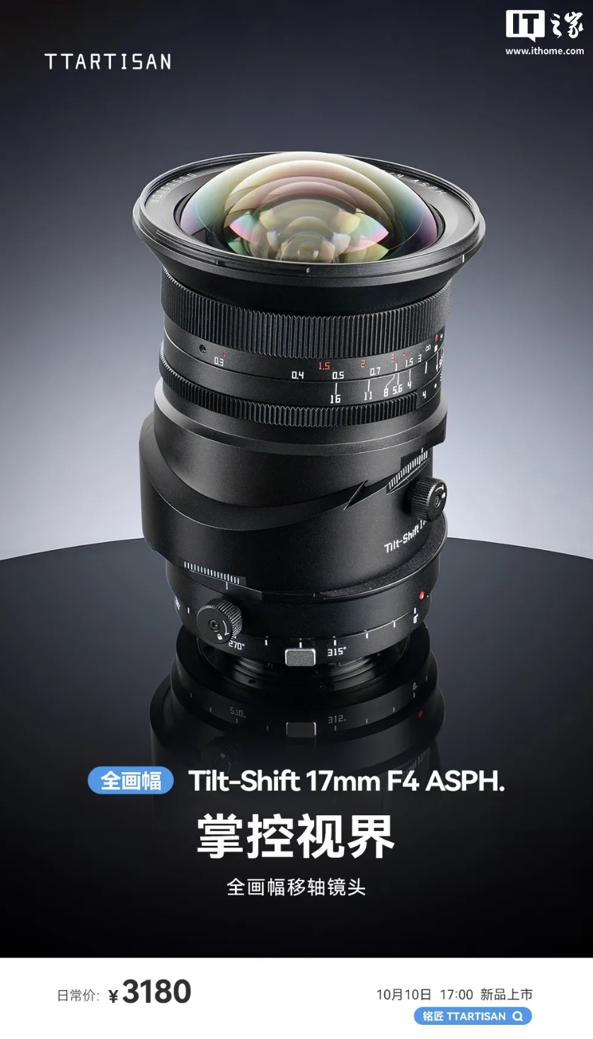 IT之家 10 月 10 日消息,铭匠今日发布了一款 Tilt-Shift 17mm F4 ASPH.全画幅超广角移轴镜头,日常价 3180 元,首发价 2980 元。