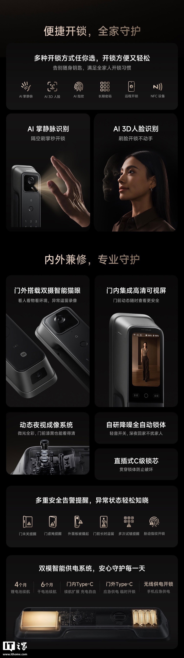 据介绍,这款门锁匹配 3MP 160 度广角主摄及 2 MP 128 度广角辅摄,匹配 3.97 英寸室内屏,同时支持手机、电视等多设备跨屏联动看门前,提供“AI 掌静脉、AI 3D 人脸、AI 指纹、长期密码、NFC、门卡、手机远程、手机蓝牙、机械钥匙”解锁。