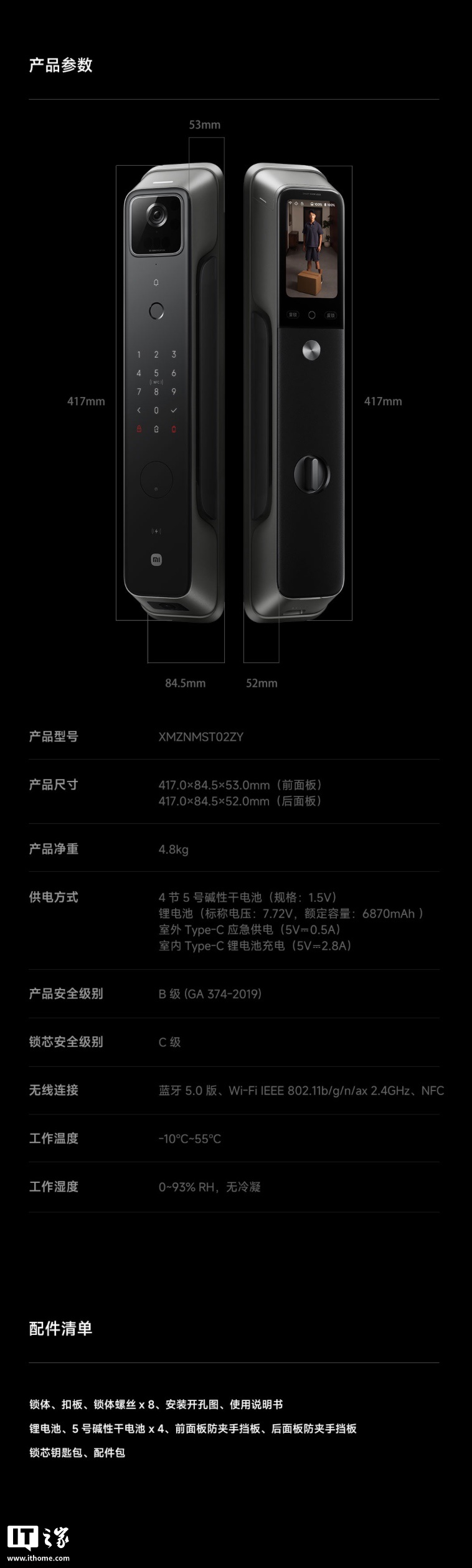 该门锁使用双模智能供电系统,匹配 1 块 6870 毫安时电池 + 4 节 5 号碱性干电池,室外、室内均配备 USB-C 应急供电口。IT之家附产品参数如下: