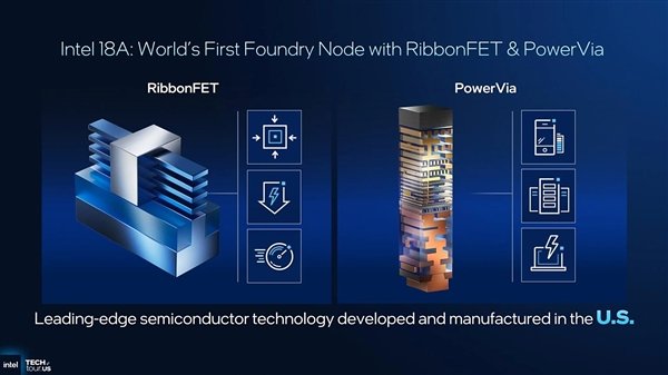 18A中的A代表埃米,Intel之前表示这是全球首个埃米级芯片工艺,大家可以理解为1.8nm,而且同时使用了GAA晶体管结构和PowerVia背部供电设计,技术上亮点不少。