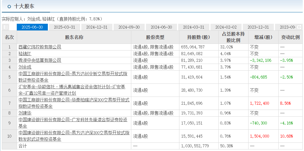 公司股权结构稳定,实际控制人为 创始人刘金成,骆锦红夫妇 (直接持股比例:7.83%)。公司十大股东主要如下所示: