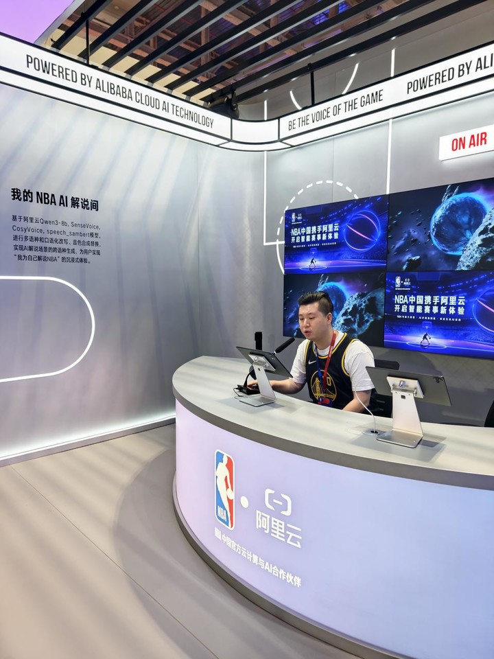 这不是开玩笑,还真能实现。同样在场外的互动区, 我就体验了一个名为「CosyVoice 2.0 X NBA 球迷 AI 解说体验」的项目:录制 10-15 秒的任意语音, 然后系统就能用我的声音给 NBA 经典瞬间配解说。