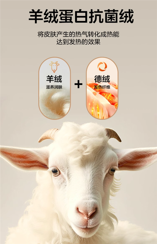 羊绒蛋白抗菌绒将皮肤产生的热气转化成热能,达到发热的效果。