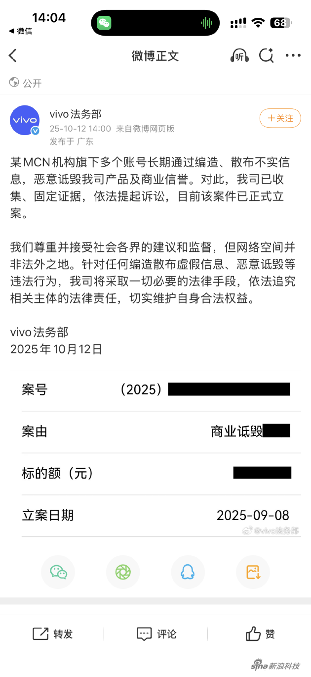新浪数码讯 10月12日下午消息,vivo法务部通过官方微博宣布,已就某MCN机构旗下多个账号长期编造、散布不实信息、恶意诋毁vivo产品及商业信誉的行为,向法院提起诉讼,目前案件已正式立案。