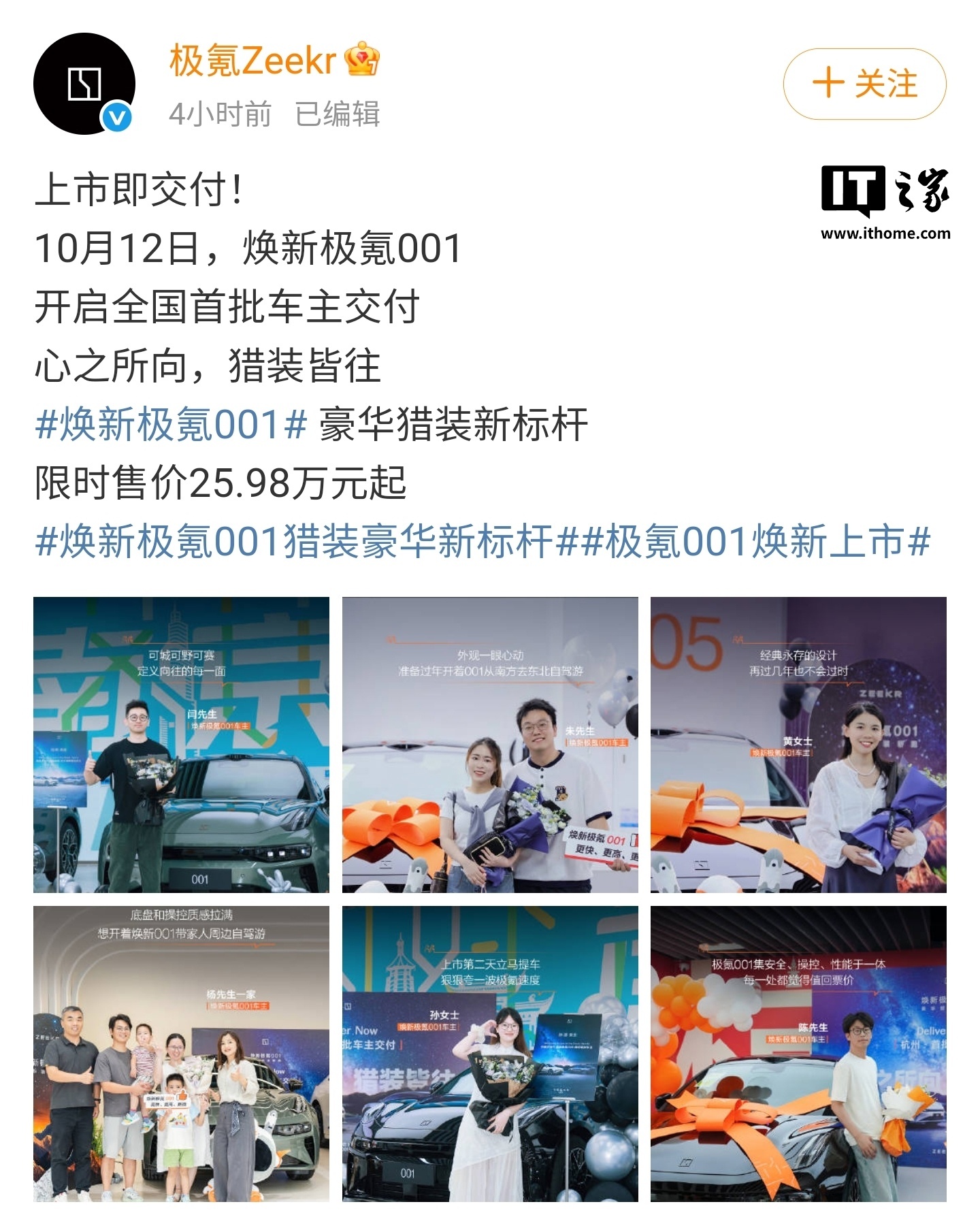 IT之家 10 月 12 日消息,极氪汽车今日宣布,焕新极氪 001 开启全国首批车主交付。这款新车于昨晚刚刚上市,售价 26.98 万元起,可限时叠加 1 万元置换金。