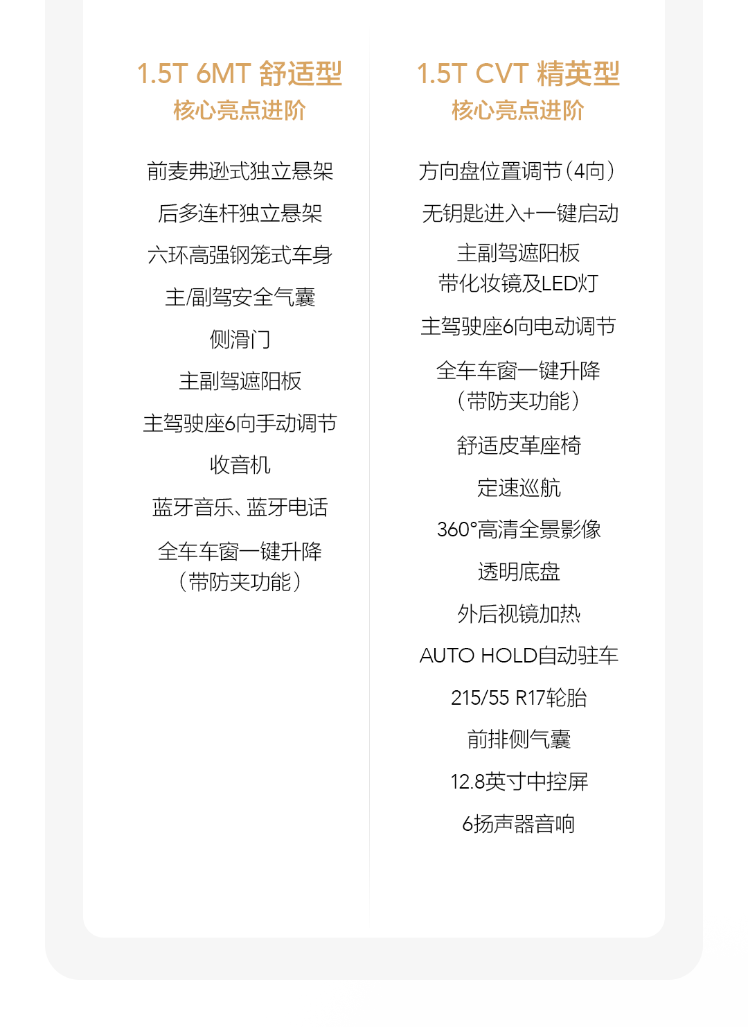 • 燃油 1.5T 6MT 舒适型 / CVT 精英型:均采用同级领先的全新 1.5T 高扭矩发动机,最大扭矩至高可达 290N・m,标配六环高强钢笼式车身、主 / 副驾安全气囊、主驾车窗一键升降(带防夹功能)等配置,CVT 精英型标配了方向盘位置调节(4 向)、无钥匙进入 + 一键启动、主驾驶座 6 向电动调节、全车车窗一键升降(带防夹功能)、定速巡航、360° 高清全景影像、透明底盘、外后视镜加热、AUTO HOLD 自动驻车、12.8 英寸中控屏等配置。