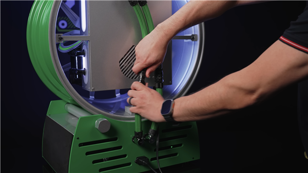 为了冷却整个系统,Justin将定制的水冷系统单独设计在轮毂装置的下方,这个隔间容纳了水泵、储液罐、散热器以及整个循环的管路,通过轮毂背面的快速断开接口连接到CPU和GPU。