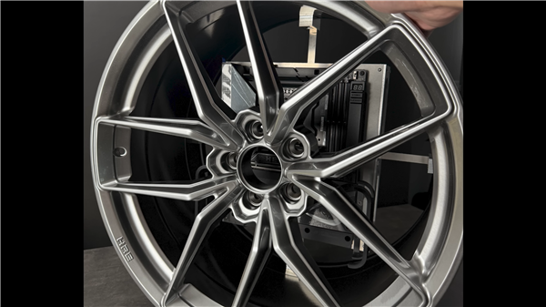 托架内还包含了一个电源,以及为公版RTX 5080供电的PCIe线缆,托架周围还安装了小型LED扩散器,为轮毂提供了一种微妙的环境光,类似于真实汽车的下部灯光效果。