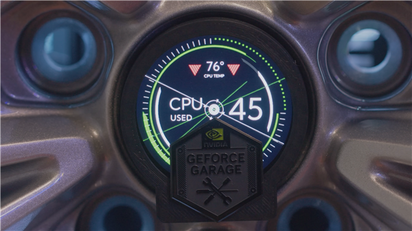 冷却系统不仅为电脑散热,还充当了轮毂的展示架,从功能到美学上都与轮毂相得益彰,轮毂中心的盖子被升级为一个显示屏,旁边还有一个小的GeForce Garage徽章。