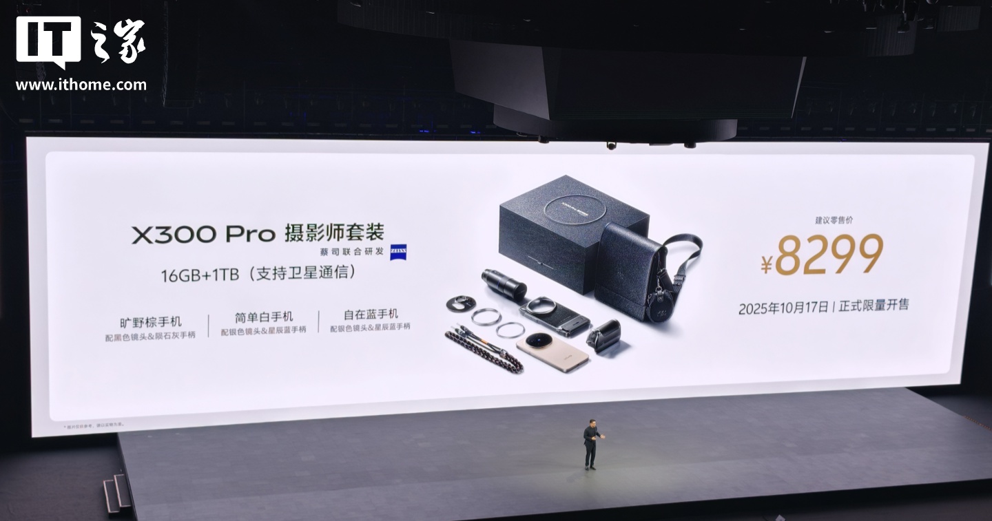 此外,vivo 还推出了 X300 Pro 摄影师套装 16GB+1TB (支持卫星通信),建议零售价 8299 元,10 月 17 日限量开售。IT之家附三个版本: