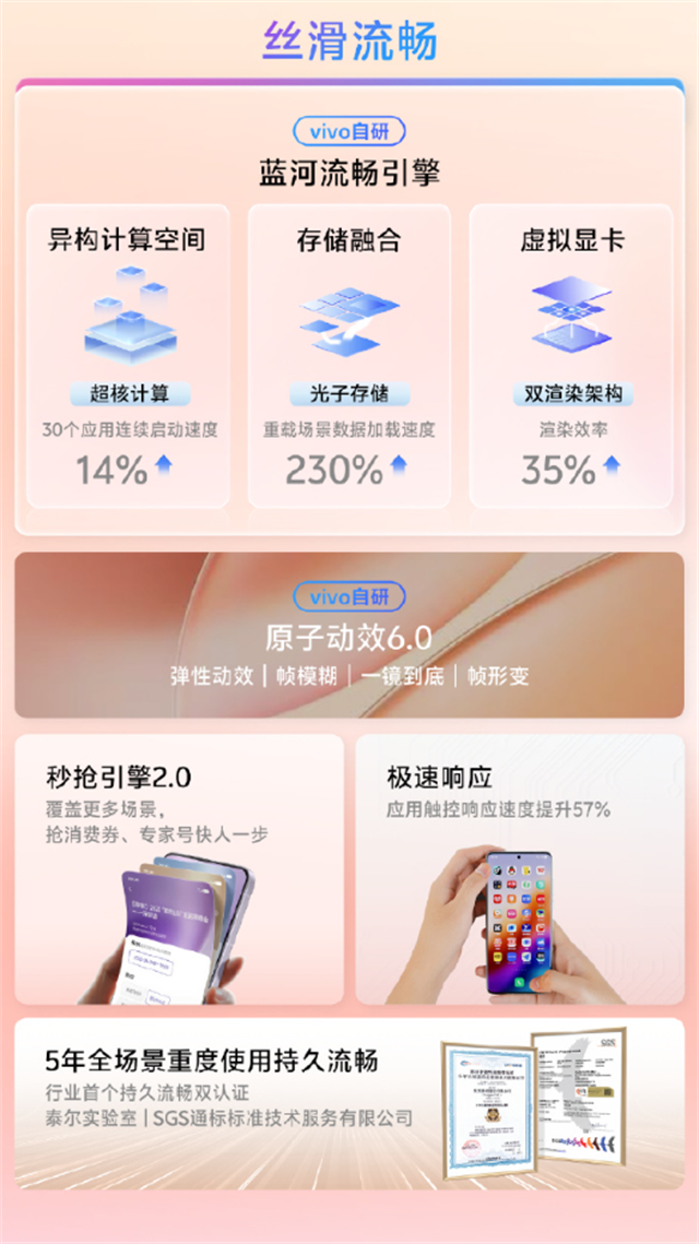 这一次的OriginOS 6虽然在设计上依然延续了此前的风格,不过流畅度大幅度提升了,主要是采用了重构调度系统,解决传统调度重要任务资源分配 不均衡问题,提升算力使用效率,双渲染架构大幅提升渲染效率,显著降低渲染资源开销。并且更是给出了5年持久流畅的承诺。