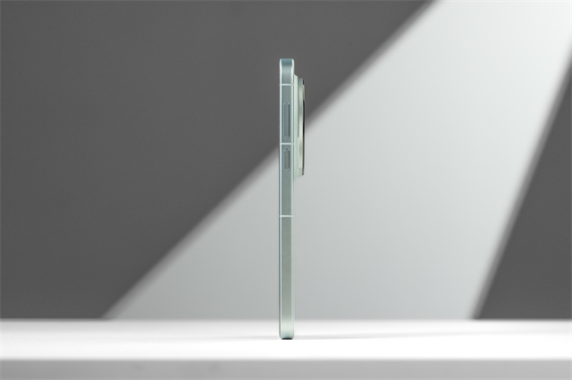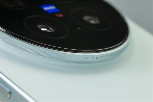同时机身和摄像头Dceo的过渡也是非常舒适的,弧形的设计让摄像头模组一体感更强,弱化了摄像头的凸出感,另外还能看到一些设计的细节,从手机上面往下看镜头上部分,镜头侧壁参数刻字。
