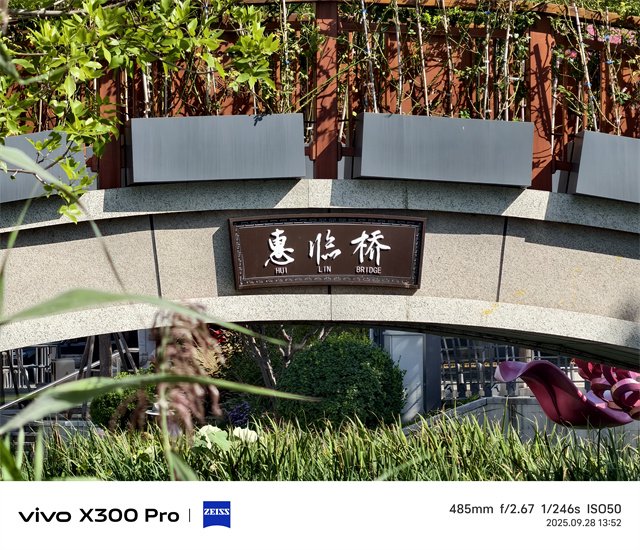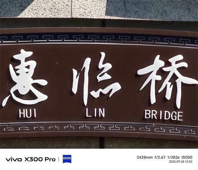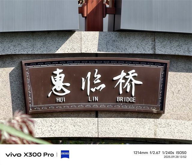 说完了硬件,我们就来看看样张的表现吧,首先能够看到vivo X300 Pro的长焦表现非常强悍,即使在100倍的极端倍率下,也能清楚的看到远处桥上的字,包括下方的英文小字,都能拍摄的清清楚楚,除了自身2亿像素APO的加持外,更好的AI算法也是不可或缺的。