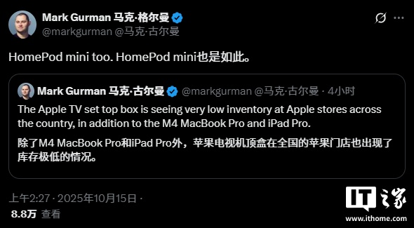 然而,古尔曼在社交媒体 X 平台上最新发文称,Apple TV 和 HomePod mini 在苹果零售店的库存已非常低。