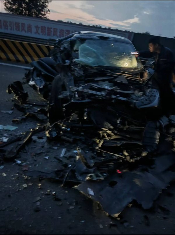 可以看到车头溃缩区域全部碎裂,挡风玻璃也被撞碎,甚至右侧两扇车门不翼而飞,地面上满是散落的各种零部件。