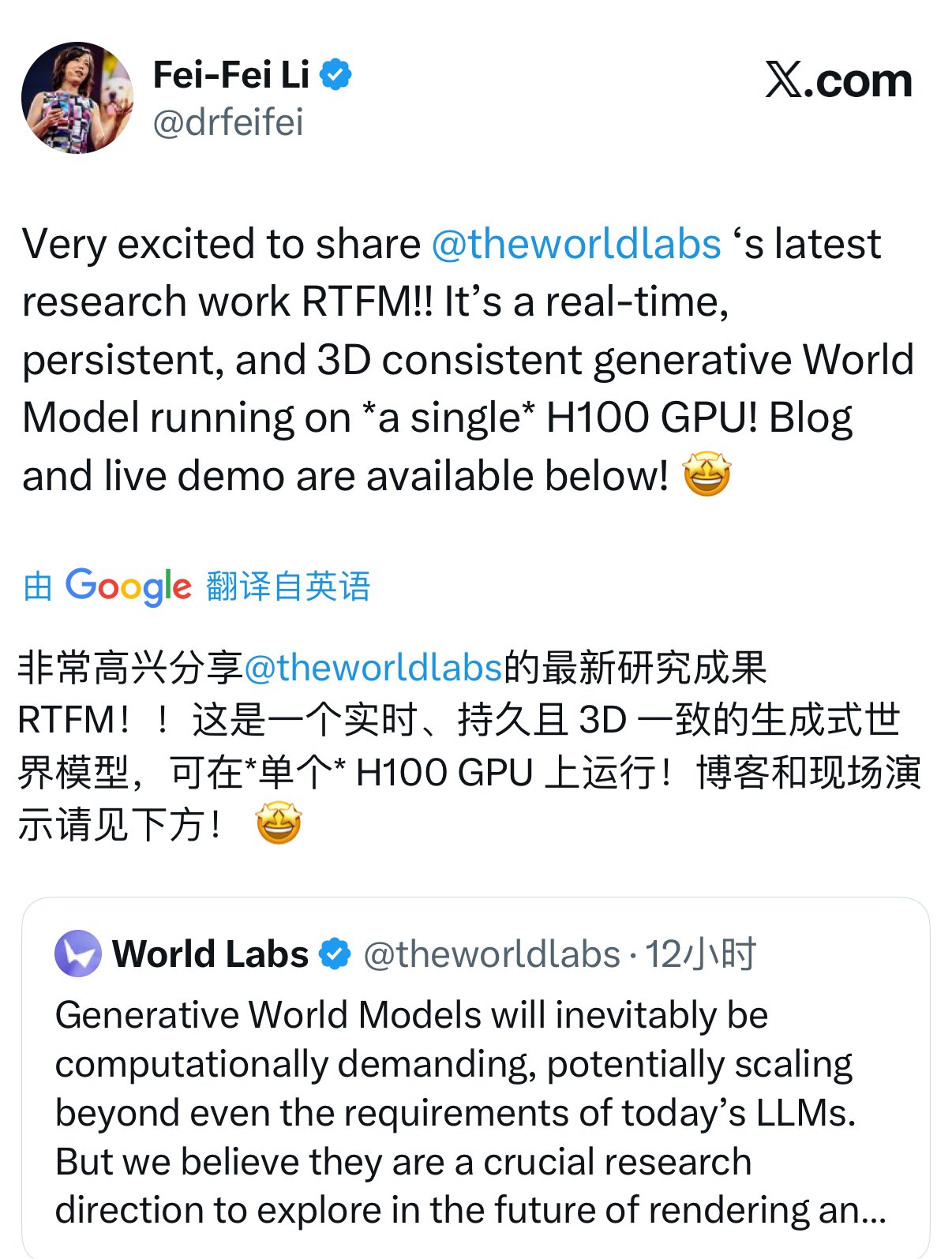 AI教母、斯坦福大学教授李飞飞的创业公司 World Labs 又上新了。当地时间10月16日,李飞飞转发推文介绍全新实时生成式世界模型RTFM(Real-Time Frame Model),称这是一个实时、持持续运行且保持3D一致性的生成式世界模型,亮点是可在单个H100 GPU上运行。