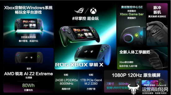 尽掌控,超会玩!首款纯血XBOX掌机,ROG XBOX掌机X于北京时间10月16日15:00正式发布,并于当天晚21:00正式开售,首发价6499元。ROG此次联合微软XBOX团队,实现多点定制,带来Xbox全屏体验、Xbox定制化系统、全新人体工学握把等多项创新设计,实现纯血进化。同时首发搭载AMD锐龙AI Z2 Extreme处理器、配备7英寸1080P 120Hz原生横屏、内置80Wh电池,内外全面升级,赋予玩家全新掌机体验。