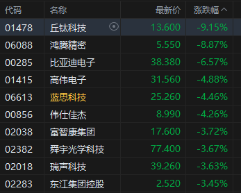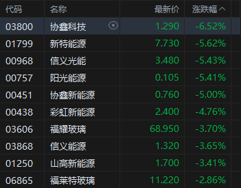 跌1.61%,报25472.96点,恒生科技指数 跌2.81%,国企指数跌1.67%。盘面上,科网股全线下跌,百度、阿里巴巴跌超3%,美团、小米、快手、哔哩哔哩跌超2%,京东、联想、网易、腾讯跌超1%;苹果概念下挫,丘钛科技 跌超9%;半导体板块普跌,中芯国际 跌超5%;光伏太阳能股延续跌势,阳光能源 跌超5%。