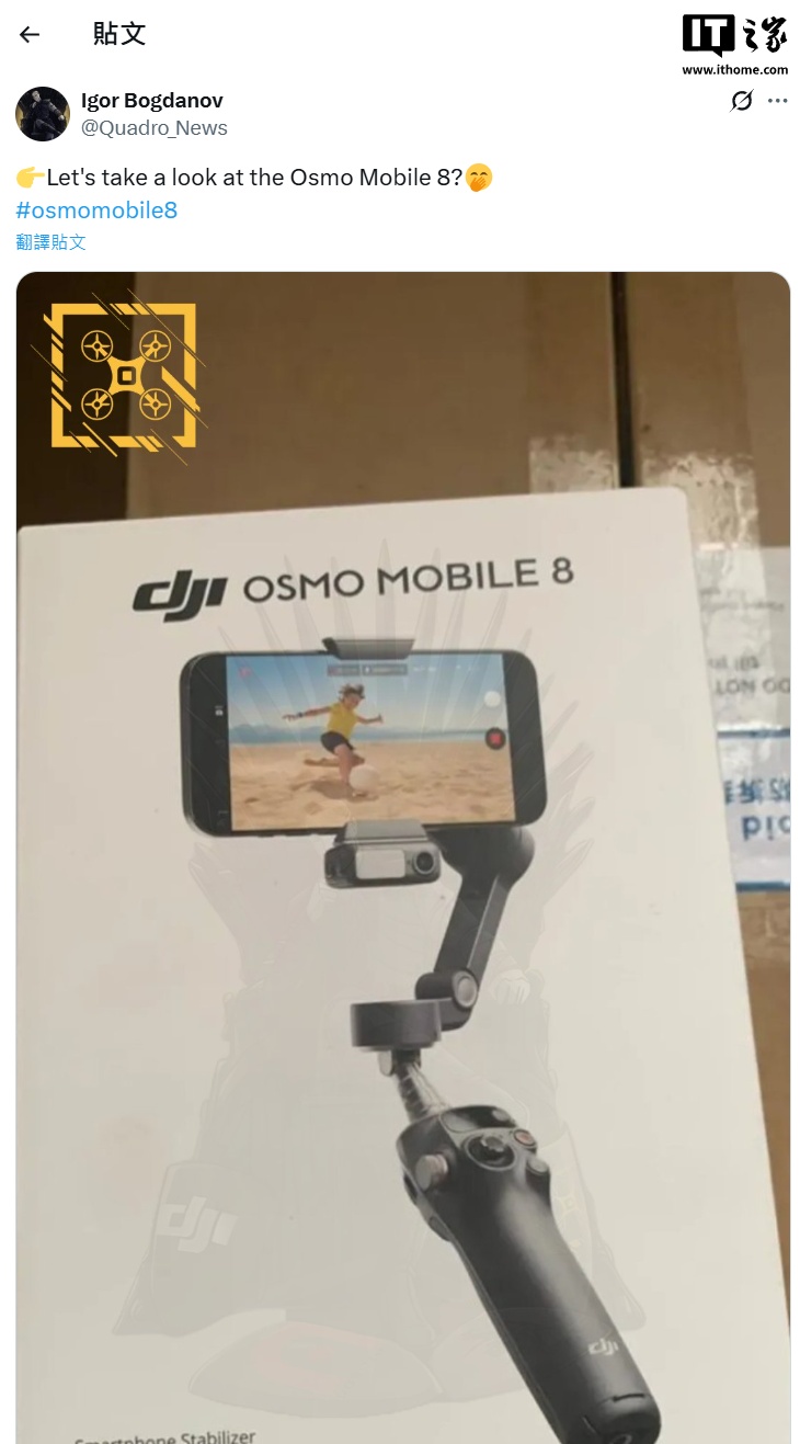 IT之家 10 月 17 日消息,消息人士 Igor Bogdanov 今天在 X 平台发文,曝光大疆 Osmo Mobile 8 手机稳定器的实拍图及包装盒。