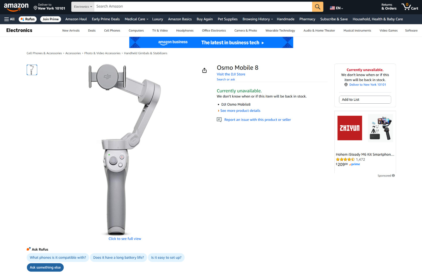 据IT之家此前报道,Osmo Mobile 8 曾短暂现身美国亚马逊平台,标价 149 美元(IT之家注:现汇率约合 1062 元人民币)。