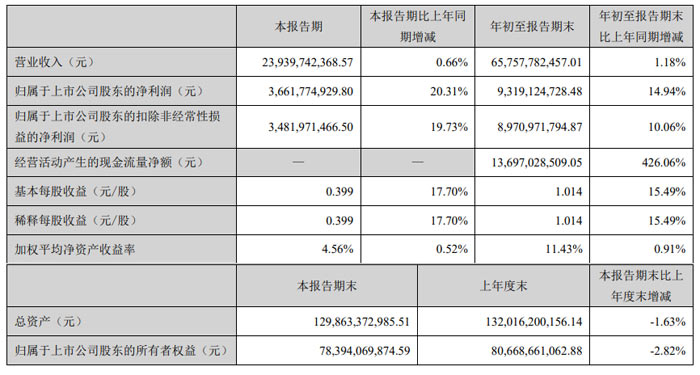 从年初至 9 月末的累计数据来看,公司整体经营韧性凸显。累计实现营业收入 657.58 亿元(65,757,782,457.01 元),同比增长 1.18%;累计归属于上市公司股东的净利润 93.19 亿元(9,319,124,728.48 元),同比增长 14.94%;基本每股收益 1.014 元 / 股,同比增长 15.49%,股东收益同步提升。