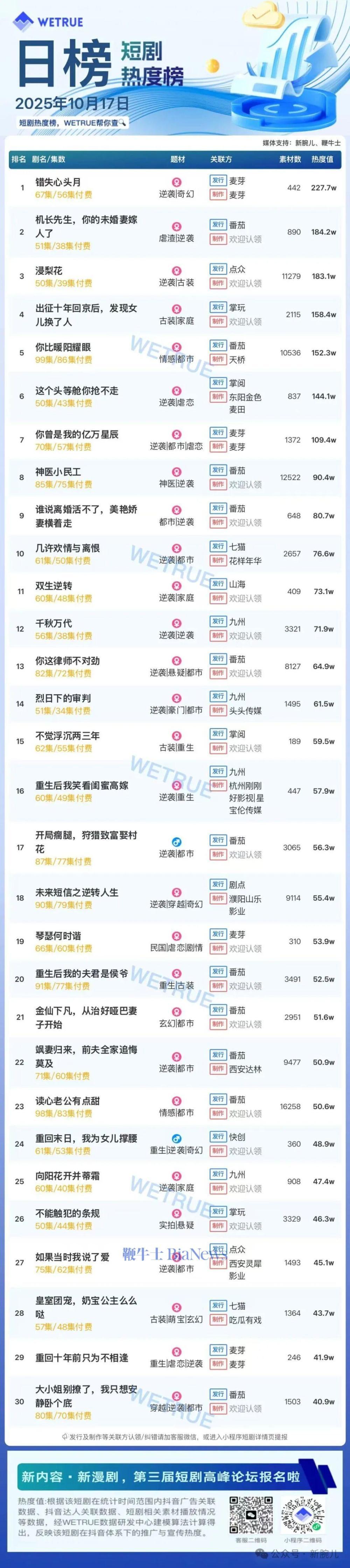 1、本日榜为 WETRUE短剧数据公司提供, 新腕儿和鞭牛士提供联合支持。