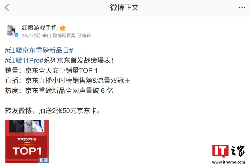 IT之家 10 月 18 日消息,红魔游戏手机官方今日宣布:红魔 11 Pro 系列京东首发战绩“爆表”,京东全天安卓销量 TOP 1、京东直播小时榜销售额 & 流量双冠王、京东重磅新品全网声量破 6 亿。
