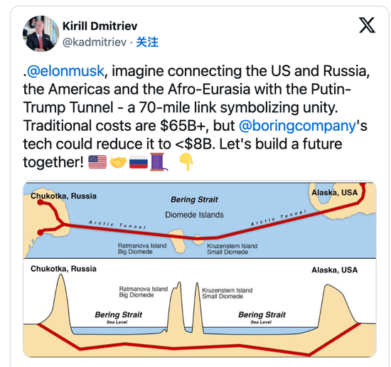 俄罗斯主权财富基金负责人Kirill Dmitriev在社交媒体上提议,由马斯克旗下Boring Company建设一条连接俄罗斯与阿拉斯加的白令海峡海底隧道,将其命名为“普京-特朗普隧道”。这一提议出现在特朗普与普京本周通话后,他将该隧道包装为俄美关系可能出现缓和迹象的“标志性项目”,两国领导人近期将在匈牙利布达佩斯会晤。