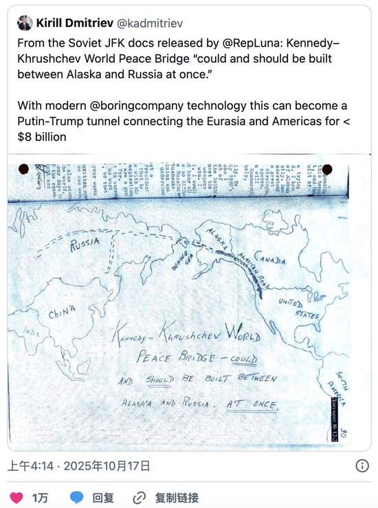 值得注意的是,他在社交媒体平台X上发布多条帖子提及这一项目。他引用了已解密的肯尼迪时代苏联文件,称当时就有在阿拉斯加与俄罗斯之间建设“世界和平桥”的构想,并表示“应该立即建造”。