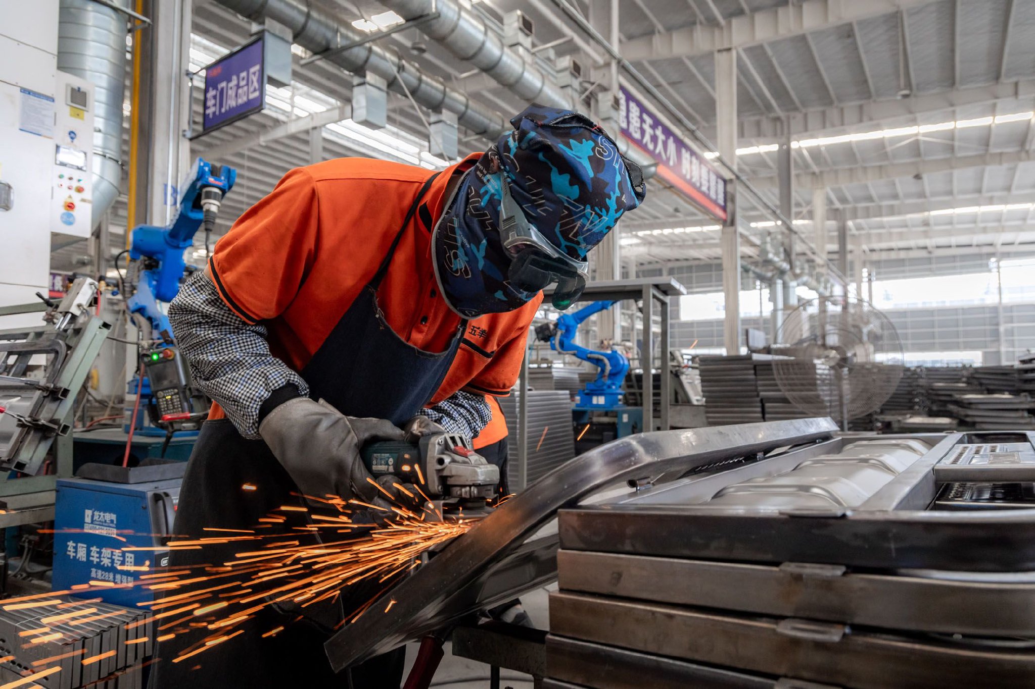 近年来,江苏省徐州市丰县大力发展集研发、生产、销售于一体的电动车产业链。全县累计拥有电动三轮车整车及配套企业1000多家,年整车生产能力超500万辆。图为丰县电动车生产企业车间内的工人在研磨电动三轮车配件。