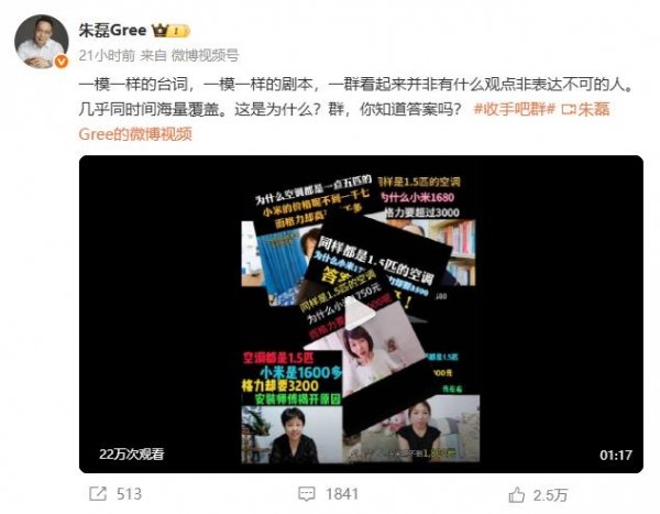 朱磊在另一条微博中指出:“一模一样的台词,一模一样的剧本,一群看起来并非有什么观点非表达不可的人。几乎同时间海量覆盖。这是为什么?群,你知道答案吗?”文案所配视频内容显示,几位博主用相似的话术在开头表示“同样是1.5匹的空调,小米1700元、格力3000多元。”