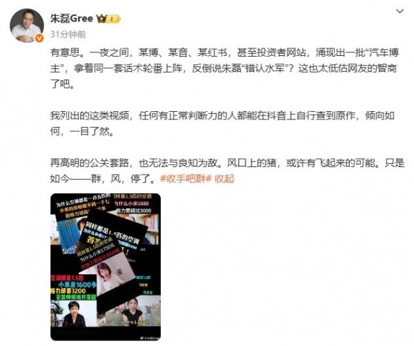 对此,朱磊在今日发布最新回应称:“有意思。一夜之间,某博、某音、某红书,甚至投资者网站,涌现出一批“汽车博主”,拿着同一套话术轮番上阵,反倒说朱磊“错认水军”?这也太低估网友的智商了吧。我列出的这类视频,任何有正常判断力的人都能在抖音上自行查到原作,倾向如何,一目了然。再高明的公关套路,也无法与良知为敌。风口上的猪,或许有飞起来的可能。只是如今——群,风,停了。”