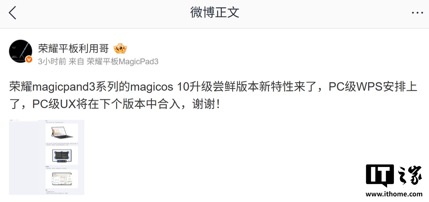 IT之家 10 月 20 日消息,荣耀终端股份有限公司平板与 IOT 产品领域总经理 @荣耀平板利用哥 今日发文宣布,荣耀 MagicPad3 系列平板的MagicOS 10 升级尝鲜版本新特性发布,上线了 PC 级 WPS 应用。此外,PC 级 UX 将在下个版本中合入。