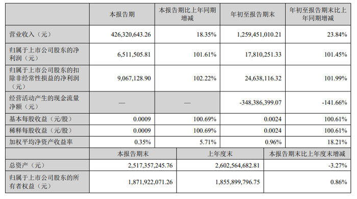根据报告数据,合力泰三季度经营业绩呈现显著改善态势。本报告期内,公司实现营业收入 4.26 亿元,较上年同期增长 18.35%;归属于上市公司股东的净利润 651.15 万元,同比增幅达 101.61%,成功实现扭亏为盈。