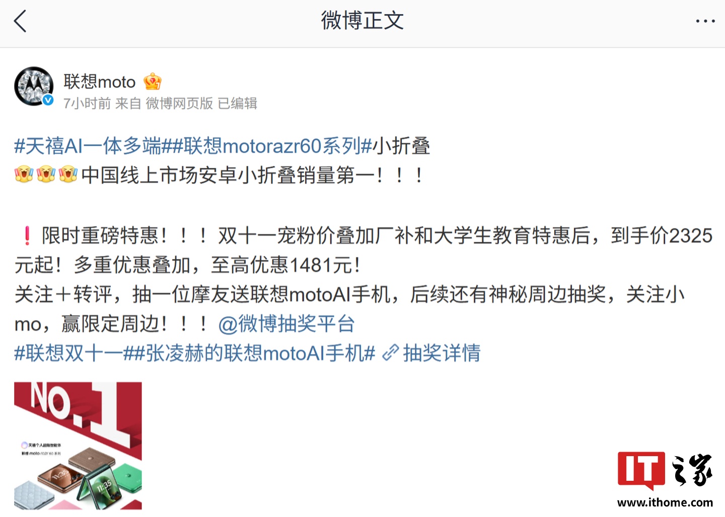 IT之家 10 月 20 日消息,联想 moto 今日发布战报,宣布 moto razr 60 系列手机获中国线上市场安卓小折叠销量第一(BCI 数据,2025 年 Q3)。