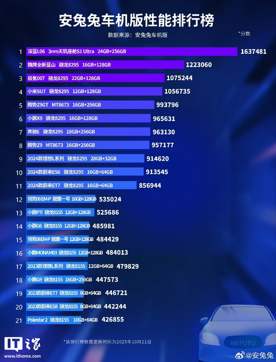 IT之家 10 月 21 日消息,深蓝汽车官方今日宣布,旗下搭载天玑 3nm 座舱芯片 —— 天玑座舱 S1 Ultra 的深蓝 L06 车型安兔兔车机跑分成绩为 1637481 分,位列榜单第一,超第二名 33%,号称“代际领先”。