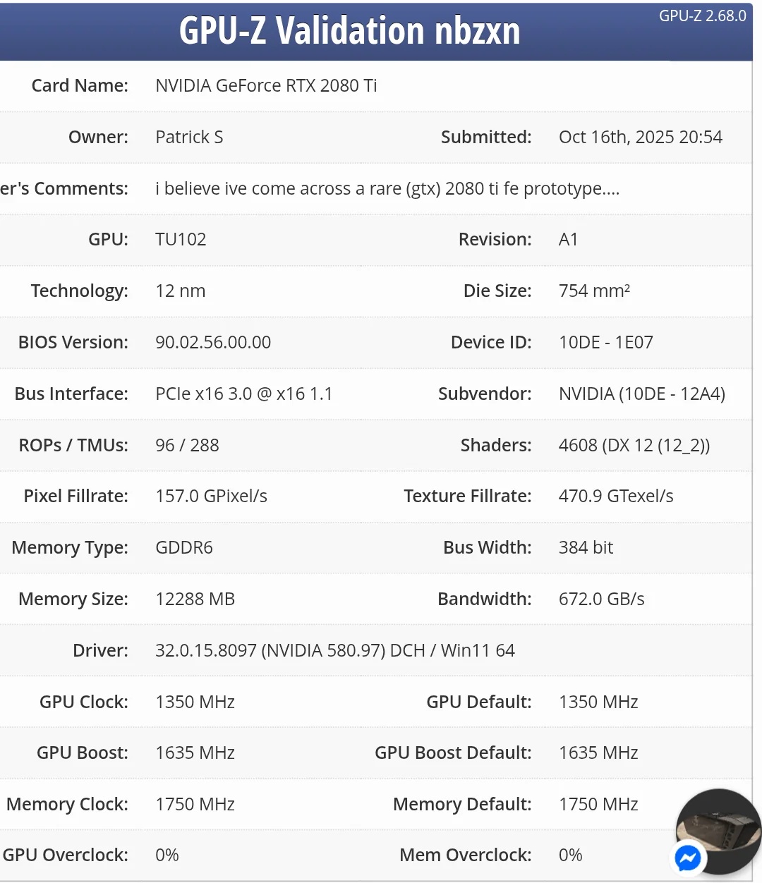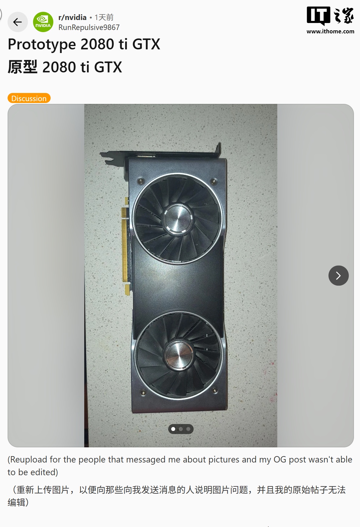 该网友原本以为该二手电脑配置中的 NVIDIA GeForce RTX 2080 Ti 可能是误标,却惊讶地发现显卡铭牌上写着“GeForce GTX”。经过 GPU-Z 检测后确认,这并非仿制品,而是一块正宗的 GeForce GTX 2080 Ti 原型卡。