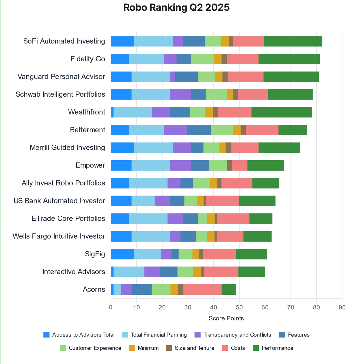 SoFi Automated Investing凭借专为日常投资者设计的功能组合夺得榜首。50美元账户门槛和0.25%的简明咨询费吸引新手,而零股交易功能使资金从第一天起即可充分利用。
