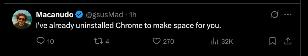 但 AI 浏览器已经是巨头新贵正在不断涌入的赛道,OpenAI 还未正式下场,就已经有了十足的火药味:预热推文评论区最高赞的评论,就是一名用户表示自己已经卸载了 Chrome,等待 Atlas,颇有点「打扫卫生再请客」的感觉。