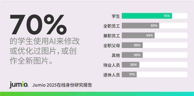 研究显示,全球范围内,学生群体既是生成式AI的早期使用者(70%的学生使用AI创作或修改图像),也最容易遭受其带来的风险影响。目前,62%的学生自信能够识别深度伪造(deepfake),而70%表示在过去六个月内接触过此类深度伪造内容。与其他职业受访者相比,学生群体对AI欺诈风险展现出更高的警觉性。