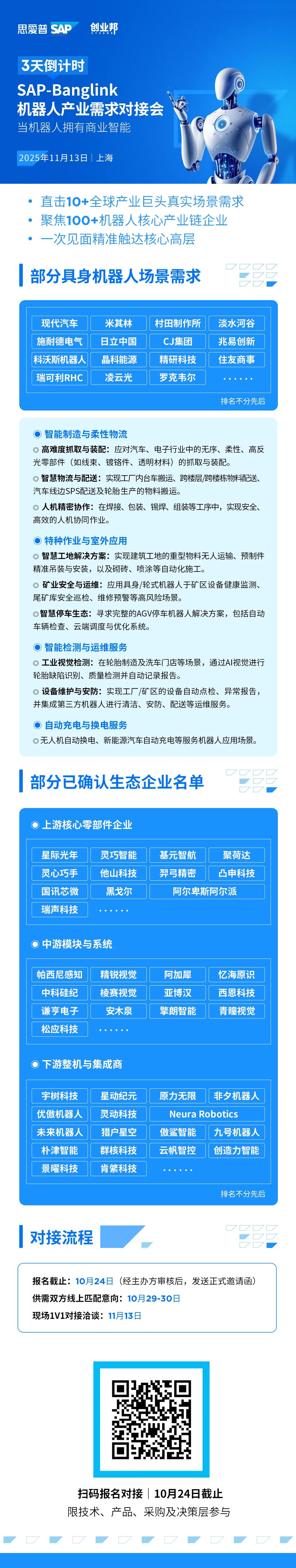 11月13日,SAP联合创业邦在上海发起 具身智能机器人产业需求闭门对接会Banglink ,聚焦真实场景需求,定向邀请100+产业链核心企业,与全球产业巨头开展1V1精准对接。