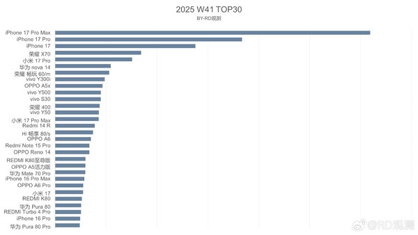 据数码博主曝光的第41周销量数据,2025年手机市场呈现出鲜明特征:iPhone 17 Pro Max以绝对优势夺冠,iPhone 17 Pro、iPhone 17紧随其后,苹果包揽前三名,排名最高的国产机型荣耀X70紧随其后。