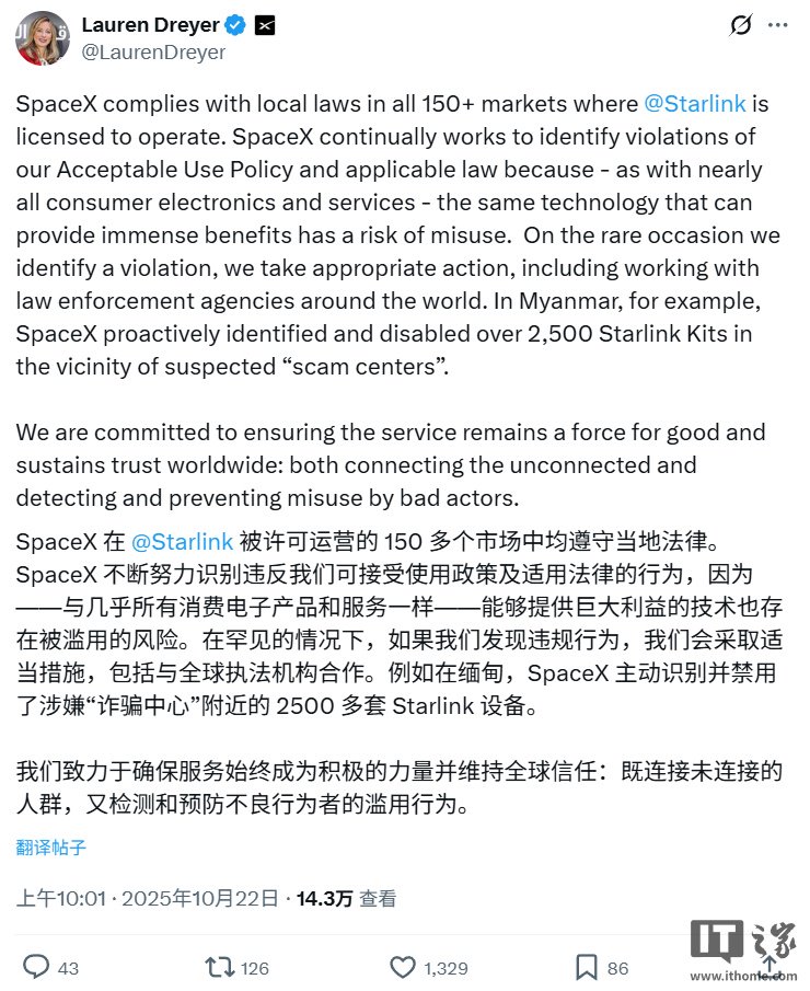 IT之家 10 月 22 日消息,SpaceX 副总裁劳伦・德雷尔今日发帖称,该公司已在缅甸电诈园区周边“主动识别”出超过 2500 台“星链”设备,并使其无法正常运转。