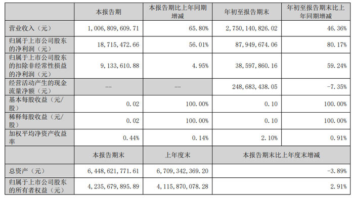 单季度业绩:本报告期内,公司实现营业收入 10.07 亿元,同比大幅增长 65.80%;归属于上市公司股东的净利润 1871.55 万元,同比增长 56.01%;扣除非经常性损益后的净利润 913.36 万元,同比增长 4.95,基本每股收益 0.02 元,同比翻倍,盈利规模与盈利能力同步提升。