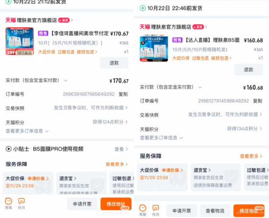 “双十一”期间,李佳琦直播间还出现了“预付订单比现货还贵”的情况。正常而言,产品在“双十一”期间多采用预付订单形式,即消费者先支付定金,后期支付尾款组成完整订单。